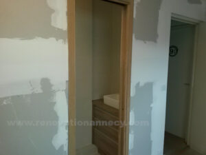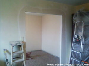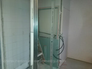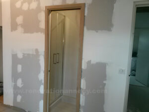 La porte à galandage nécessite une expertise spécifique. Le plaquiste installe le châssis métallique, crée ou modifie la cloison en plaques de plâtre et réalise les finitions.