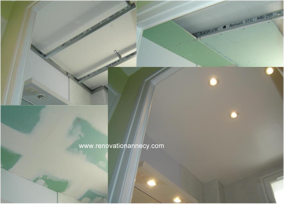 Le faux plafond est un atout majeur dans une salle de bains. Réalisé en plaques de plâtre hydrofuges, il permet :