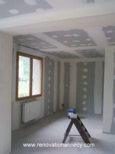 Dans un appartement en rez, jointoiement des plaques après pose de ces dernières par le client.