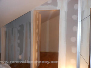 AccueilMenuiserie, Agencement AnnecyRéagencement chambre Annecy Réagencement chambre Annecy Secteur Cruseilles, non loin d’annecy,dans appartement,installation cloisons séparatrices dans chambreen vue création espace dressing.Petit grenier adjacent,fabrication et pose porte d’accèsmatériau bois dérivé.