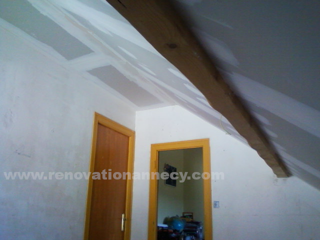 L’isolation sous toiture a été réalisée en 2 couches croisés.Une première épaisseur de laine en 60 entre chevronspuis 140 croisée avec pv.Au niveau des velux, réalisation d’embrasures en angles pour une meilleure pénétration de la lumière.Choix d’un plafond droit en fin de rampant.2 volumes distincts, en vert (plaques de platre hydro) la zone bain,blanc normal […]